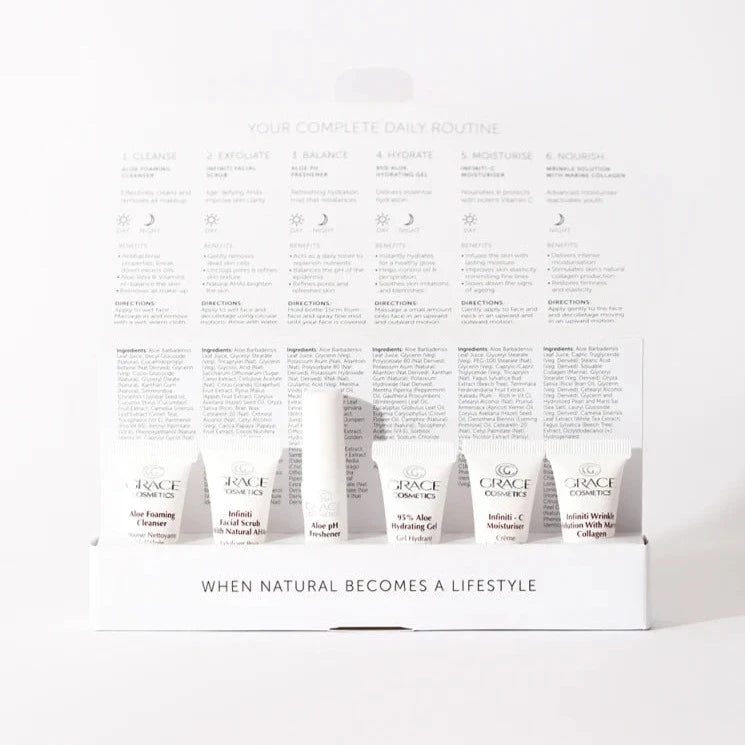 Cleanse, exfoliate, balance, hydrate, moisturise and nourish your skin with our Grace Experience Trial Pack. The Aloe Foaming Cleanser is gentle on the skin, breaks down impurities and removes all makeup, dirt and oil. The Infiniti Facial Scrub is an advanced anti-ageing exfoliator powered by AHAs that uses plant based micro-granules to effortlessly lift away dead skin cells, unclog & refine pores and brighten skin tone. The Aloe pH Freshener is an invigorating facial mist that instantly revives the skin and helps boost and maintain the skin’s moisture levels while restoring the pH balance. The 95% Aloe Hydrating Gel instantly hydrates and locks in moisture to reveal a natural, healthy glow. The Infiniti-C Moisturiser provides lasting nourishment and prevents future lines and wrinkles from forming. Finally, the Wrinkle Solution with Marine Collagen provides lasting nourishment and amplifies elastin and collagen production to help restore firmness and elasticity to the skin.