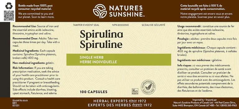 Medicinal Ingredients: Each capsule contains Spirulina platensis (spirulina) broken cells 400 mg.